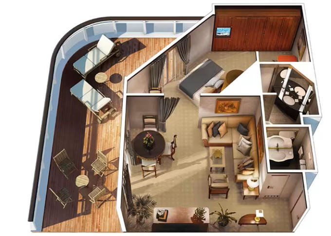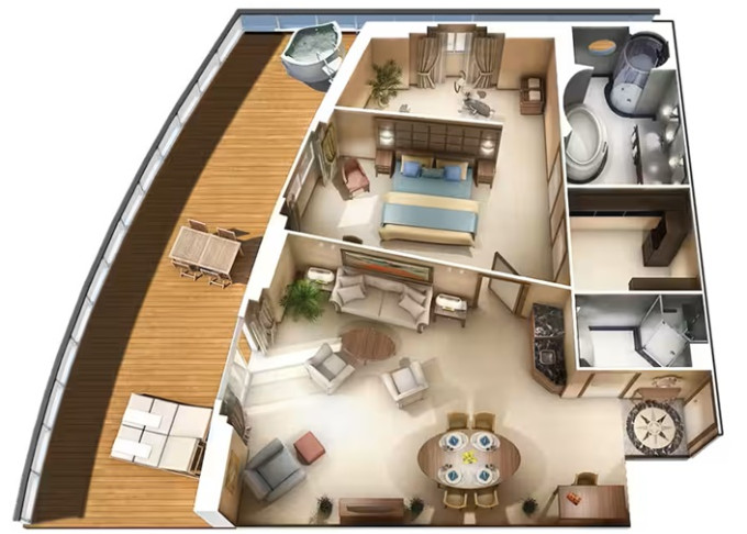 | OS - Owner’s Suite 123 m² + balkón s vírivkou od 62 m². 8. až 10. paluba vzadu. Max 2-3 osoby. 4 izby: vstupná hala s pianom, spálňa, veľká obývacia miestnosť s jedálenskou časťou, 2 kúpeľne (1 s vírivkou), 2 šatníky. Výhody Owners Suite. | 50 238 € 25 119 € za osobu | ||