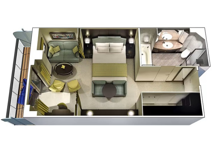 | VS - Vista Suite od 87 m² + balkón s vírivkou od 24 m². 8,9,10,12. paluba. Max 2-3 osoby. 3 izby: spálňa, veľká obývacia miestnosť s jedálenskou časťou, zariadená fitness miestnosť, 2 kúpeľne (1 s vírivkou), šatník. Výhody Vista Suite. | 36 718 € 18 359 € za osobu | ||
